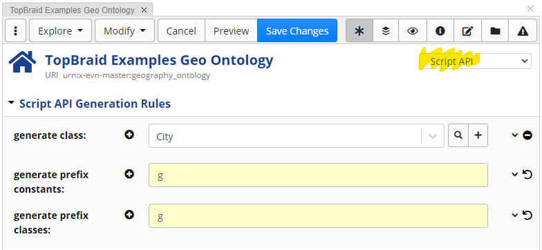 When you have created your own ontology and want the system to generate API for your classes or your namespace, go to the “Home” asset of your Ontology and switch the form to the Script API page.