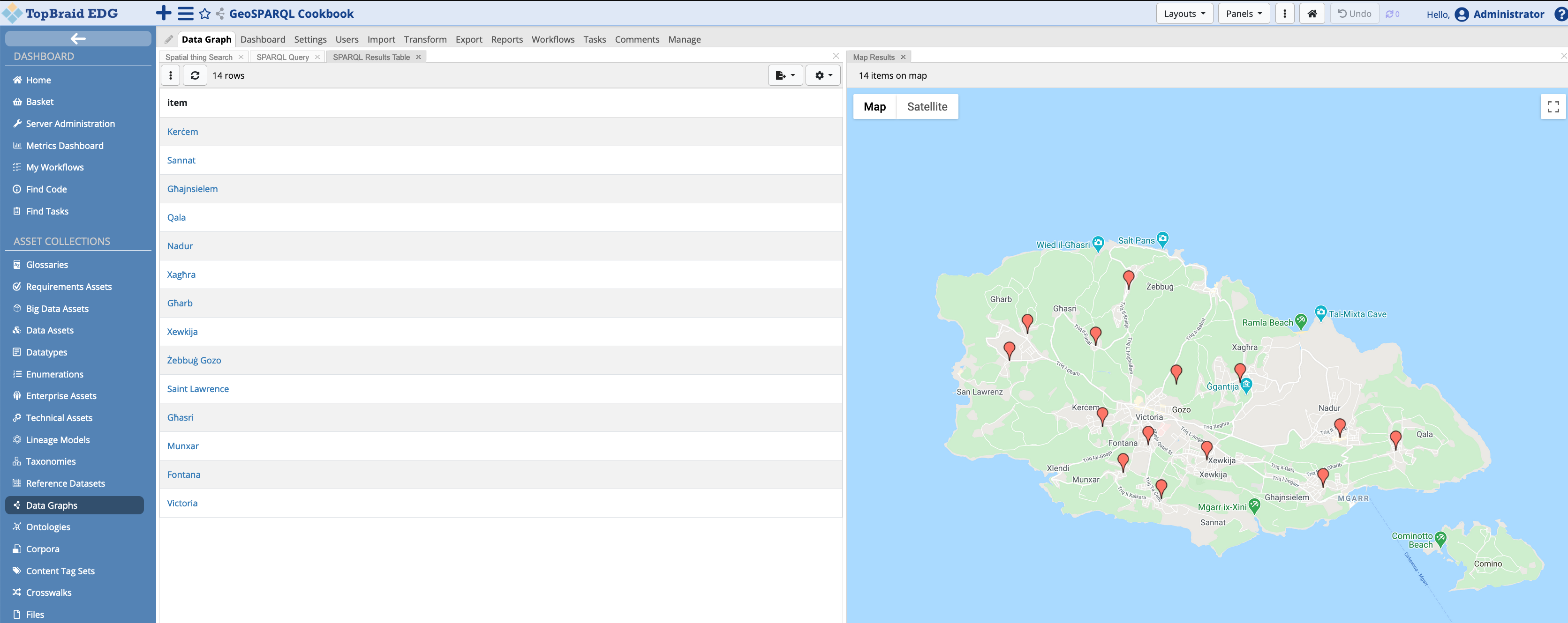 A sample data graph, is provided in the cookbook’s EDG project. In order to open the project, under Asset Collections select Data Graphs. On page load, open the GeoSPARQL Cookbook asset.